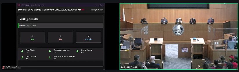 Screenshot of Board of Supervisors 5-0 vote on Tuesday, Feb. 10, 2026, to adopt resolution placing sales tax increase on the June 2026 ballot.