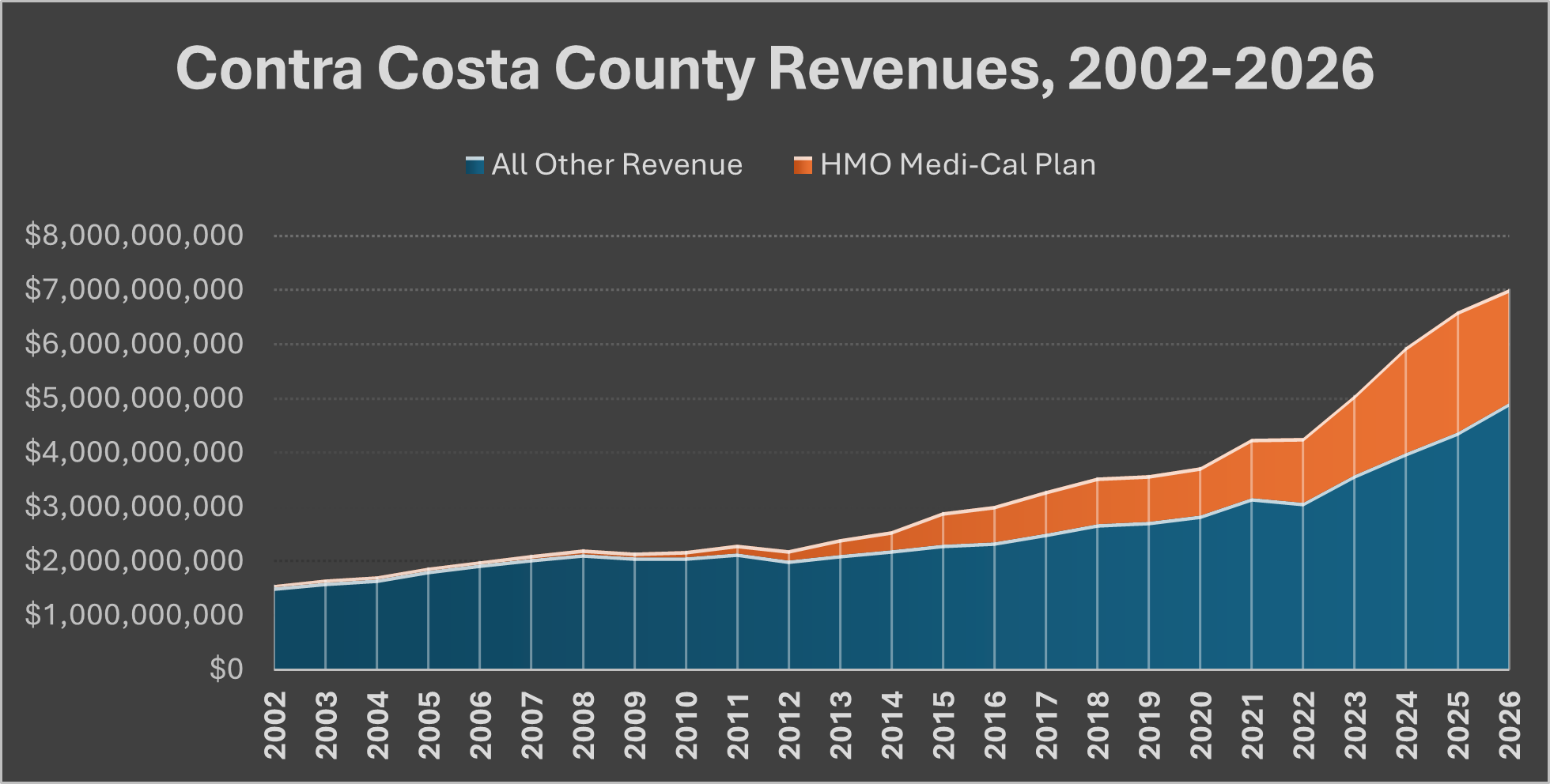 A large share of the increase relates to Medi-Cal, a federal/state program that funds healthcare for low-income residents. Contra Costa County has aggressively involved itself in Medi-Cal, creating a pioneering Health Maintenance Organization (HMO) plan to provide care to Medi-Cal beneficiaries.