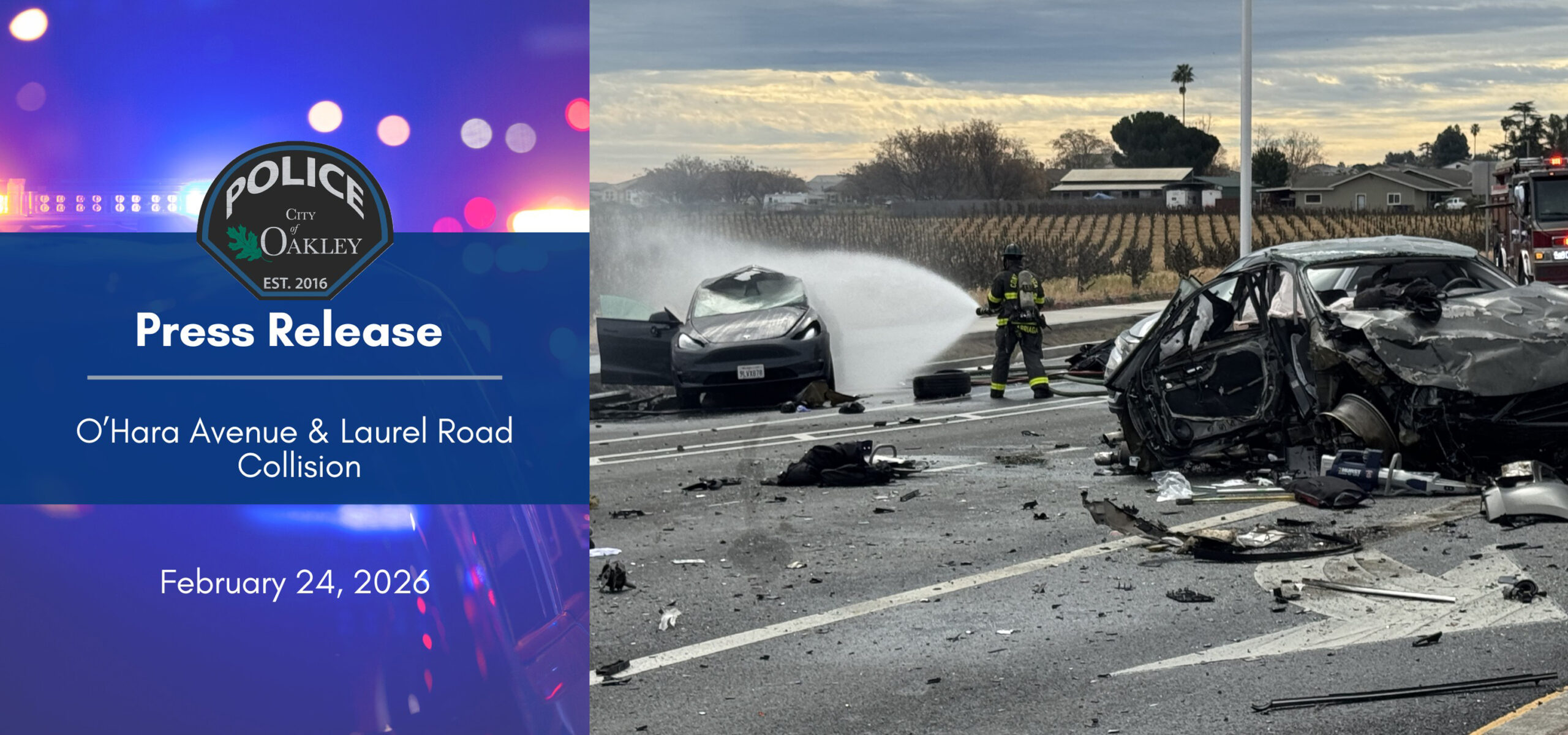 A Con Fire firefighter extinguishes the fire on of three cars involved in the fatal crash at the intersection of O’Hara Avenue and Laurel Road in Oakley on Tuesday, Feb. 24, 2026. Photo courtesy of ContraCosta.news