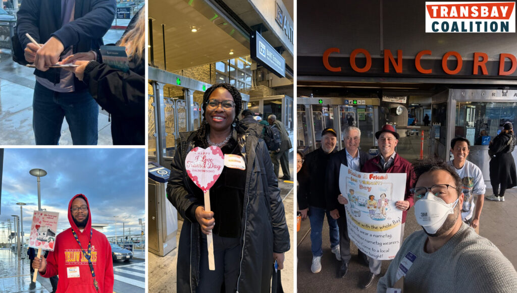 Between 7:30 and 9am at 10 BART stations, five Caltrain stations and one ferry terminal across the region, transit advocates across the region passed out materials at all corners of the Bay from Antioch to San Jose, San Francisco to Dublin/Pleasanton, Redwood City to Oakland. Despite a drizzly morning, transit riders wearing name tags with, “Hi my name is _____, ask me about ______” got to know one another while chatting about a range of topics including Bad Bunny, 3D printing, R&B, dancing, hobbits, and much more. A nice reminder that making a new friend can be as simple as getting to know your fellow transit rider.