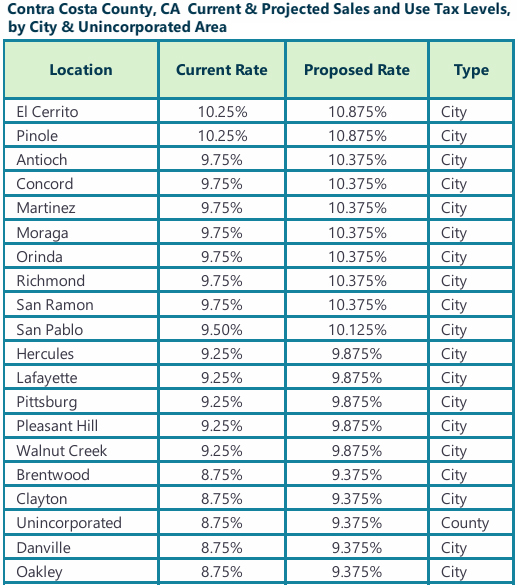 The cities with the highest current sales tax rates in the state are Alameda and Albany at 10.75%. With the proposed Contra Costa sales tax increase, El Cerrito and Pinole would have the highest sales tax rate in both the county and state at 10.875%. Antioch would have the second highest in the county at 10.375%. That does not include other sales taxes that may be passed in 2026 including the regional transit tax slated for the November 2026 ballot, which would be an additional 0.5% Countywide. (See related article)