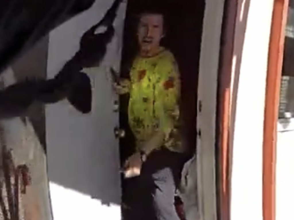Video capture of Magallan emerging from his apartment with two knives in his hands. Source: Richmond PD