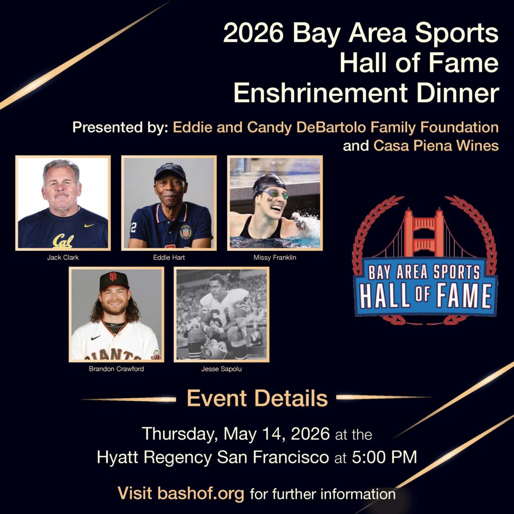 The Bay Area Sports Hall of Fame (BASHOF) Class of 2026 Enshrinement Dinner, presented in part by KNBR 680 AM, will be held on Thursday, May 14 at the Hyatt Regency Embarcadero in San Francisco. The terrific Class of 2026 inductees include, Eddie Hart (Track & Field), Brandon Crawford (Baseball), Missy Franklin (Swimming) and Jesse Sapolu (Football) and Coach Jack Clark (Rugby).