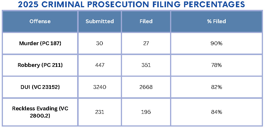 - Prosecution Results: The office’s Direct Court Unit achieved a 96% felony conviction rate for jury trials in 2025 — 15 percentage points above California’s statewide average of 81% — securing guilty verdicts in 25 of 26 felony cases tried. The Homicide Unit conducted 15 homicide trials, resulting in a total of 14 convictions, 12 of which were murder convictions – a 93% conviction rate. The Interpersonal Violence Unit conducted 20 trials involving domestic partner crimes, sexual assault, and elder abuse achieving at 85% conviction rate in the cases which reached verdicts.