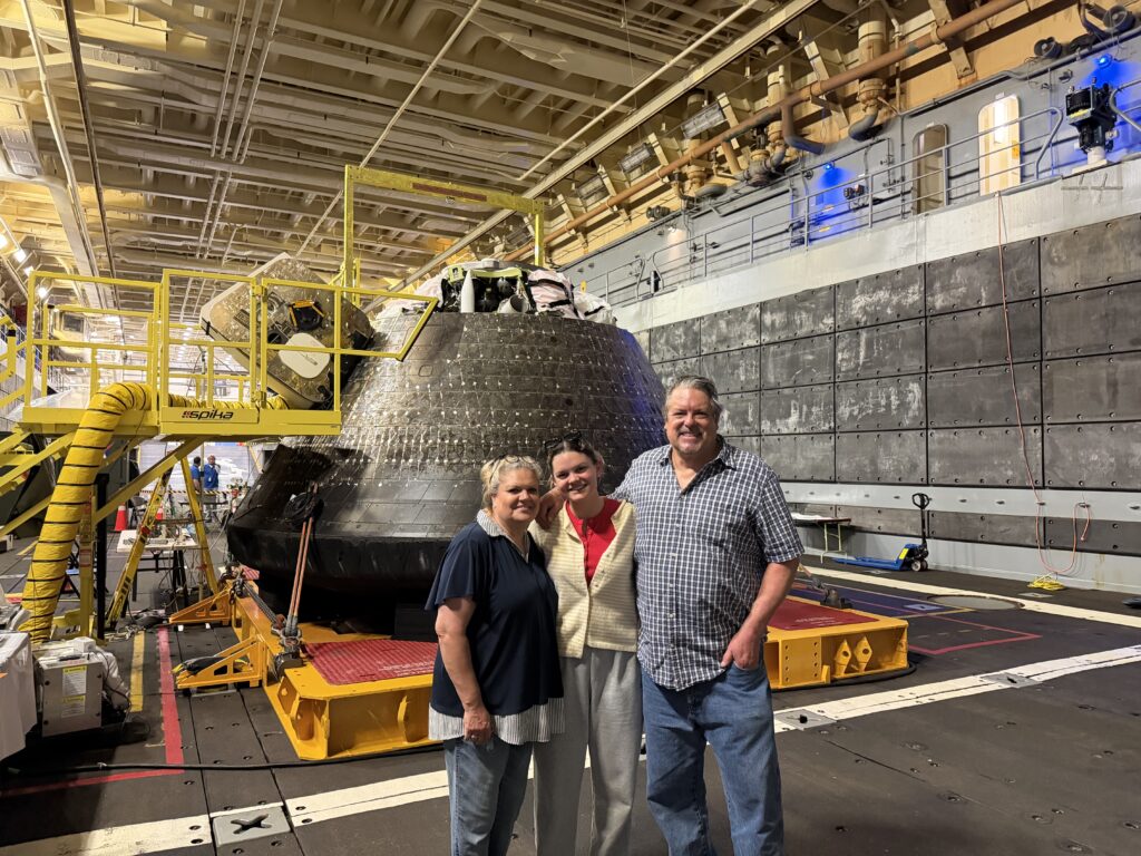 U.S. Navy Ensign Emma Crandell dressed in her “civvies” was joined by her parents Marie and Jeff Crandell to see the Artemis II mission Orion space capsule Integrity on board the John P. Murtha in April 2026. Photo courtesy of Emma Crandell.