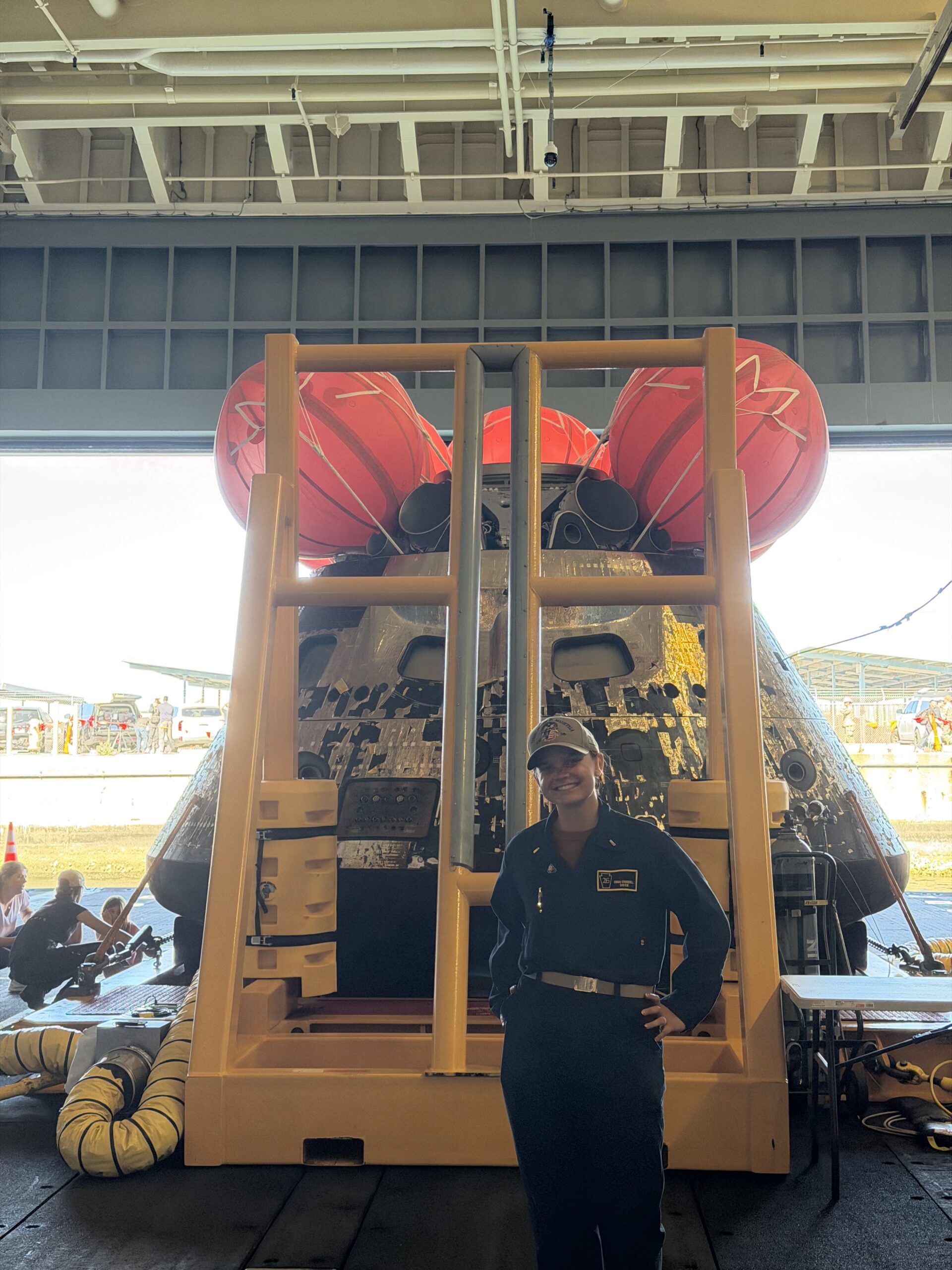 U.S. Navy Ensign Emma Crandell with the Artemis II Orion space capsule Integrity following splashdown and recovery in April 2026. Photo courtesy of Emma Crandell