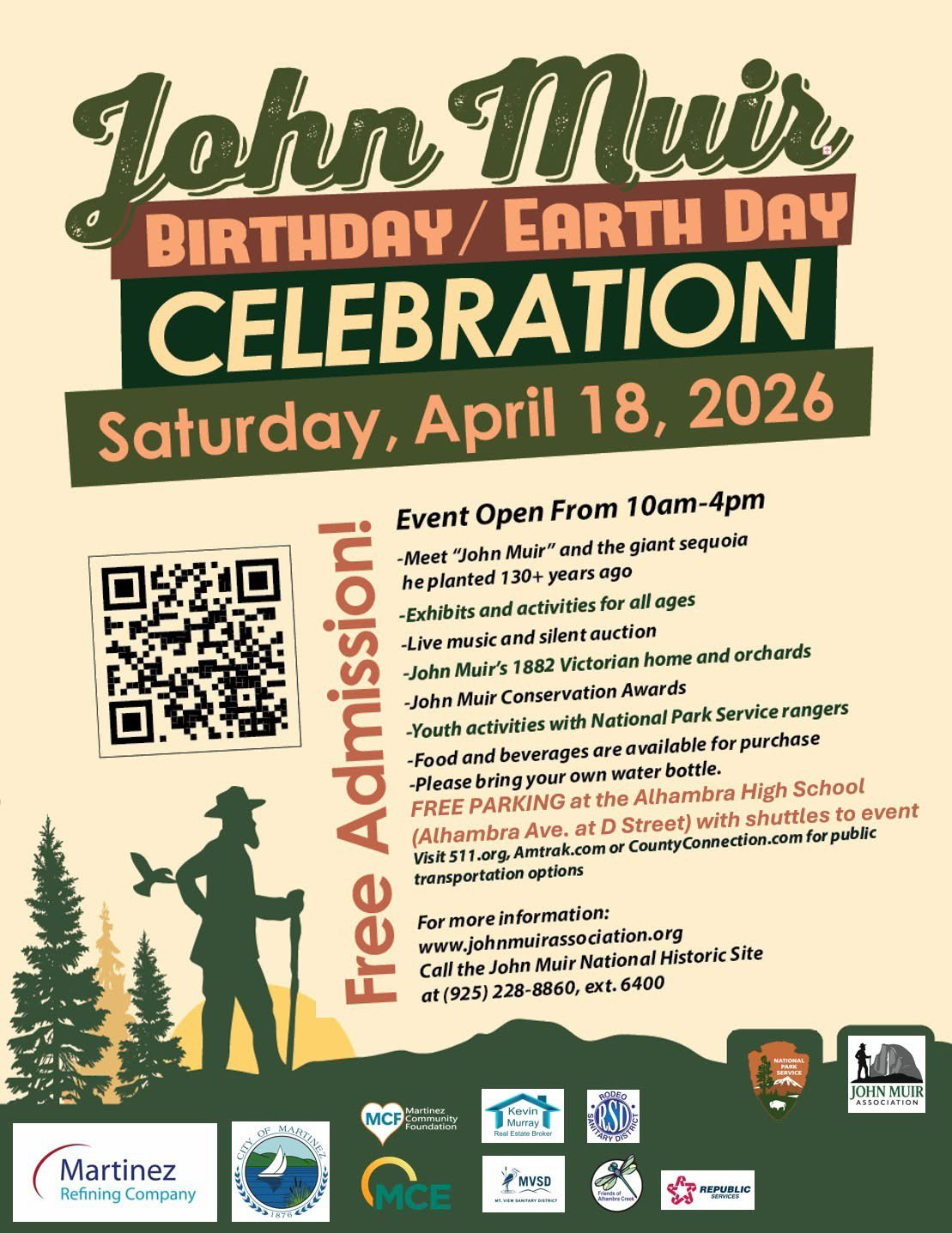 Come celebrate John Muir’s 188th birthday and Celebrating John Muir’s 188th birthday, the 56th Anniversary of Earth Day plus the 71st Anniversary of the John Muir Association Earth Day at the John Muir National Historic Site in Martinez, CA!