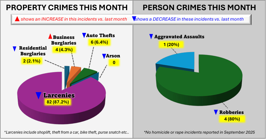 The 94 crimes included two residential burglaries, four business burglaries, six auto thefts and 82 larcenies such as shoplifting, theft from a car, bike theft, purse snatch, etc. All but business burglaries decreased over August.