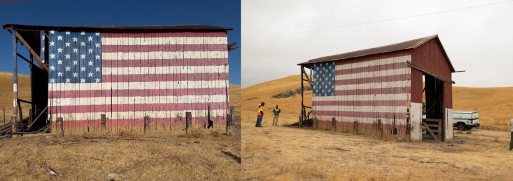 U.S. “Flag Barn” on Vasco Road near Byron before dismantling on Monday, Sept. 29, 2025. Photos: (L) City of Brentwood. (R) EBRPD