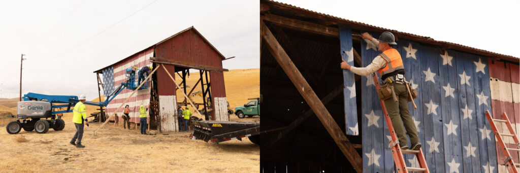 According to the City of Brentwood, “Today…staff joined the East Bay Regional Park District on Vasco Road as the dismantling of the historic ‘Flag Barn’ began. To ensure the American flag panels were not lost, staff stepped in with specialized tools and equipment to carefully remove and preserve the barn’s siding.