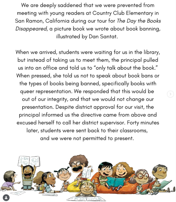 “We are deeply saddened that we were prevented from meeting with young readers at Country Club Elementary in San Ramon, California during our tour for The Day the Books Disappeared, a picture book we wrote about book banning, illustrated by Dan Santat.