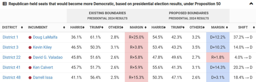 Under Proposition 50, five Republican-held congressional districts would shift to become more Democratic, based on presidential election results from 2024. Source: Ballotpedia
