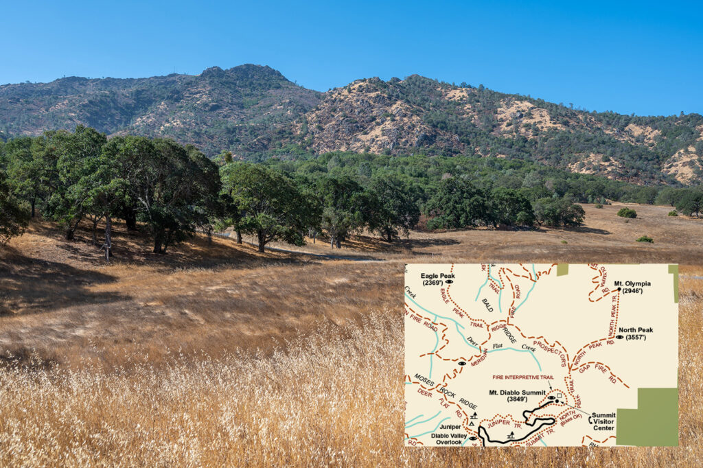 View of Mount Olympia and North Peak, at the base of which sits the Nunn-Paulsen inholding. Photo: Scott Hein. Map inset of Mt. Diablo State Park peaks and trails. Source: trailmeister.com