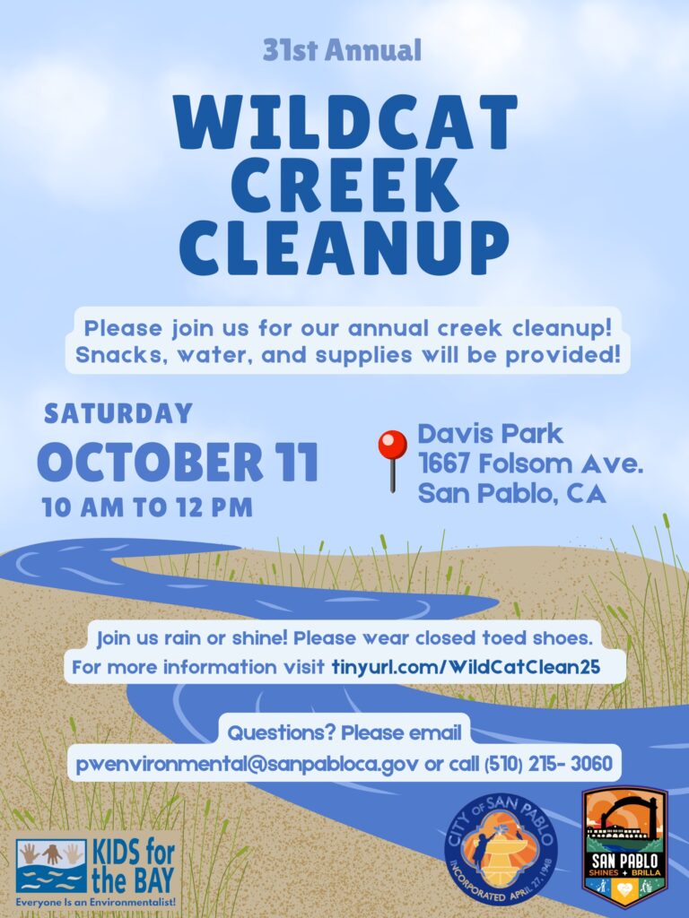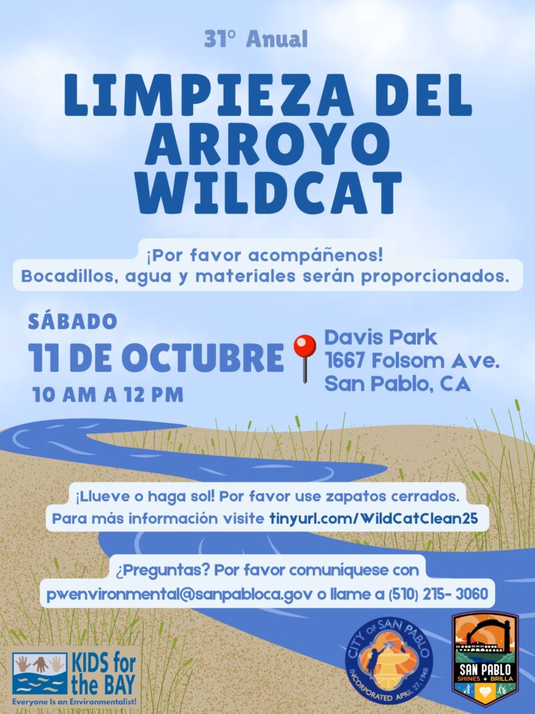 Este evento familiar da la bienvenida a todas las edades para ayudar a cuidar nuestro arroyo y nuestra comunidad. Se proporcionarán bocadillos, agua y suministros de limpieza. Por favor recuerde usar zapatos cerrados y traer su espíritu comunitario. ¡Nos vemos allí, llueva o truene! #WildcatCreekCleanup #SanPabloShines #SanPabloBrilla