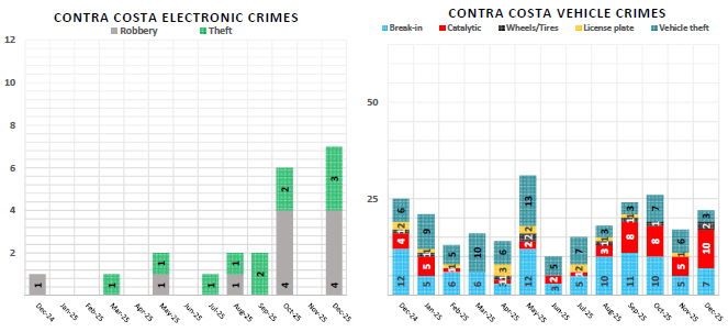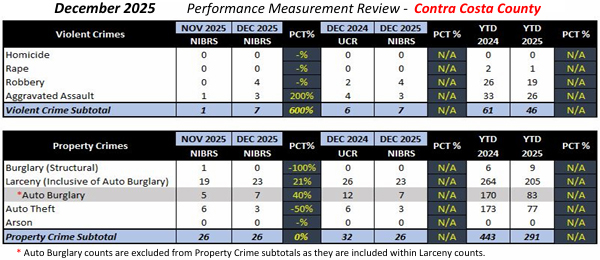 In Contra Costa County violent crime was down 24.6% from 61 incidents to 46 and property crime decreased 34.3% from 443 incidents to 291. The only category that increased was burglary structural with 50% more incidents from six to nine.