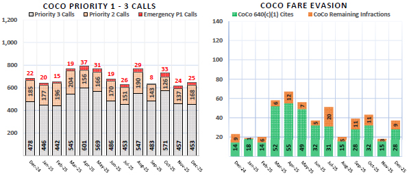 BART PD boosted the visible safety presence in the system by doubling officer presence systemwide and ensuring police are riding trains more. This approach is strengthened by BART’s ongoing use of unarmed Crisis Intervention Specialists, Transit Ambassadors, Fare Inspectors, and Community Service Officers.