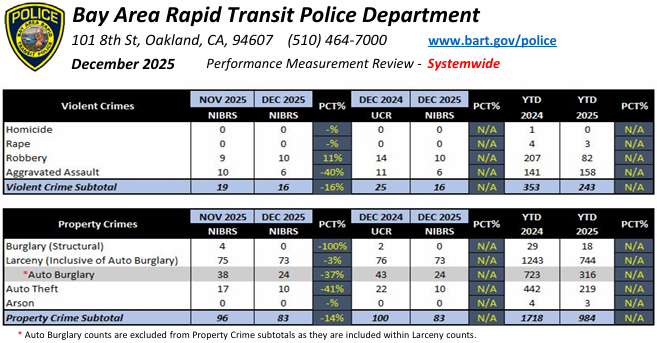 Crime on BART plummeted in 2025, a testament to the hard work of the BART Police Department and the effectiveness of BART’s investment in initiatives and infrastructure that both increase safety and enhance the customer experience.